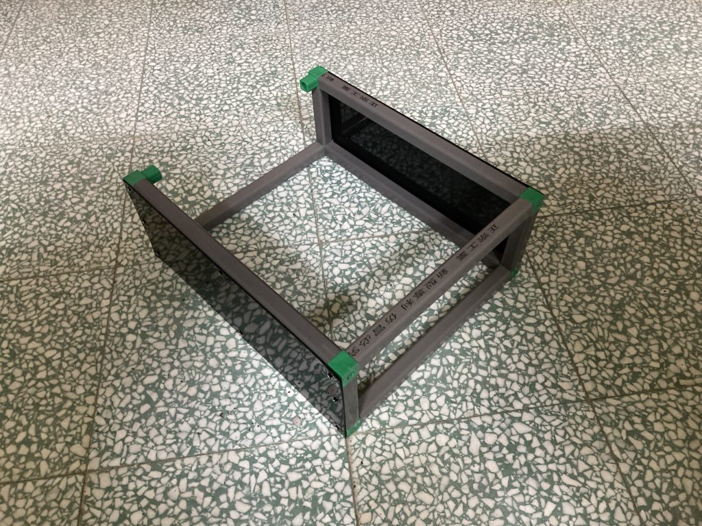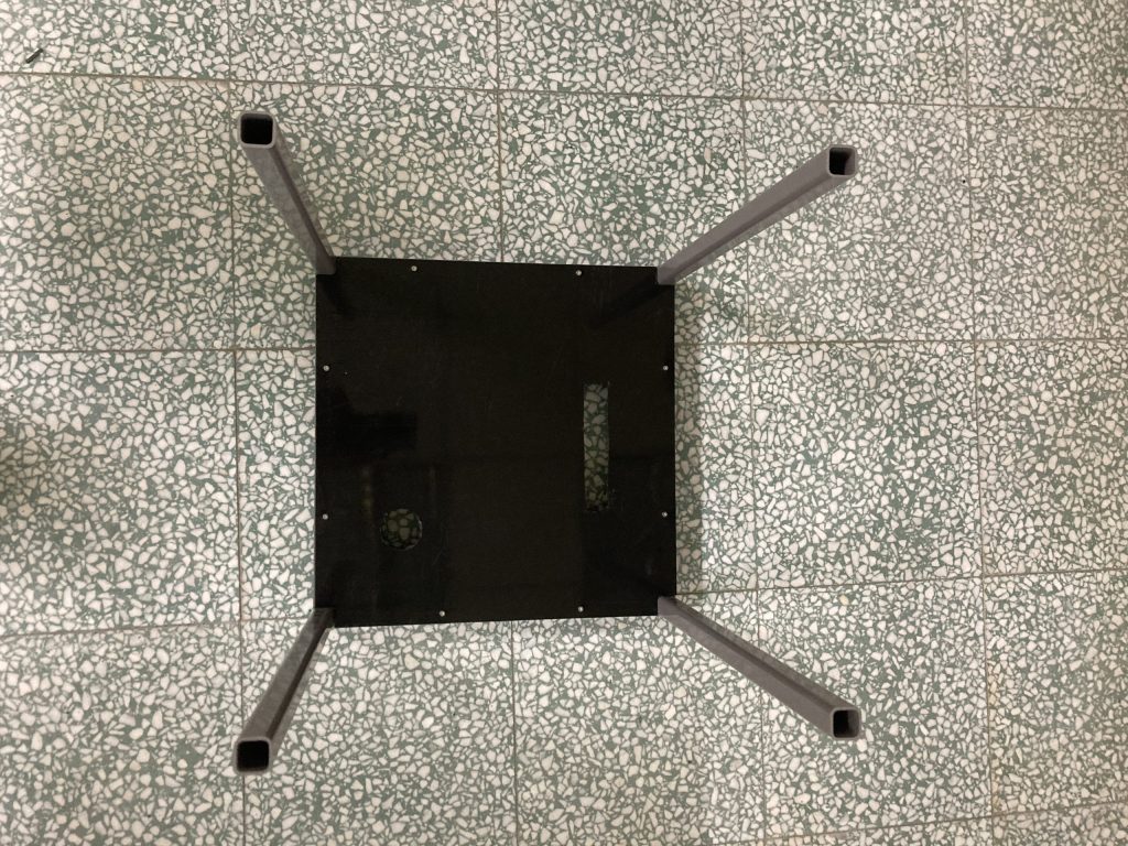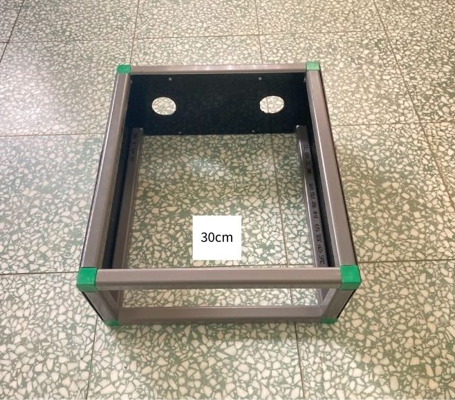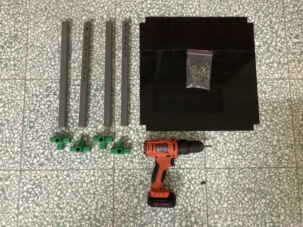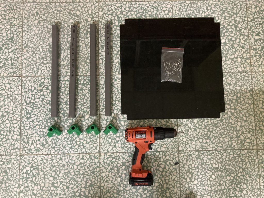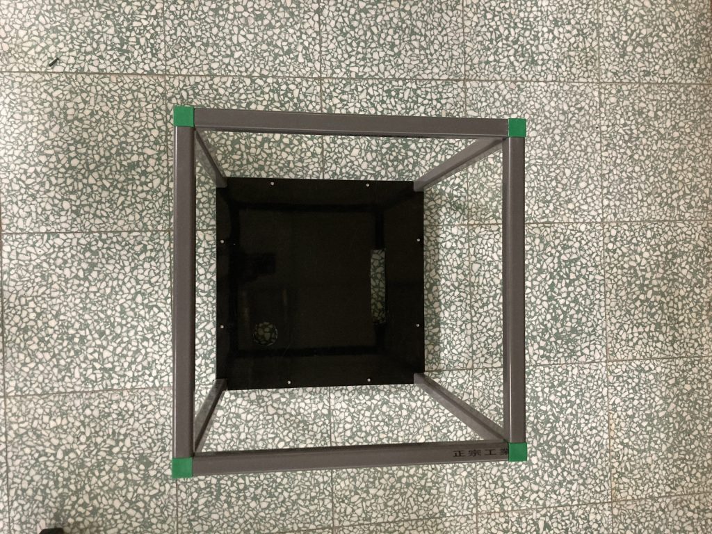 (1.2d) 方管(30cm)與前一步驟完成部件進行組裝,並用電鑽將HDPE 黑色板材(40.2cm*34.2cm*1.5mm)與其鎖上,組裝後如下圖所示。