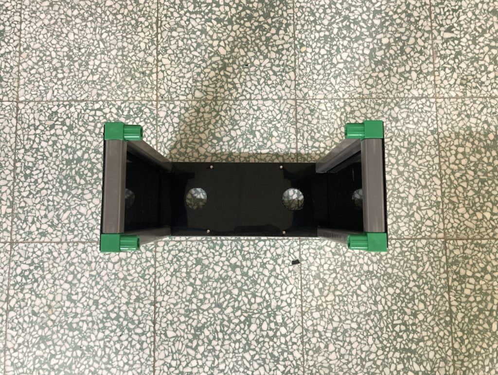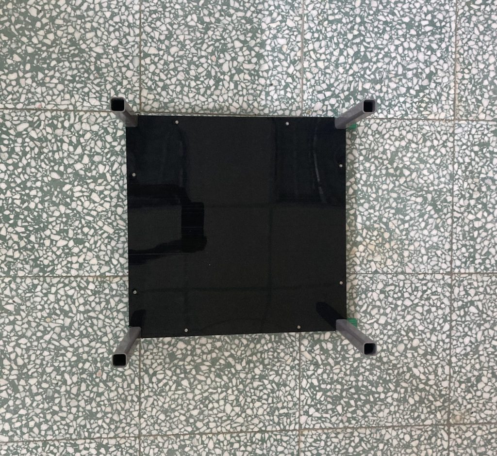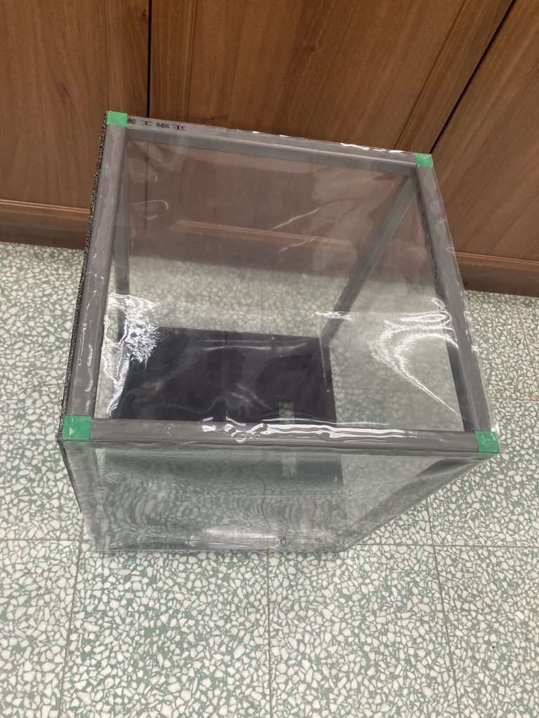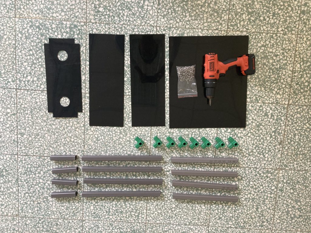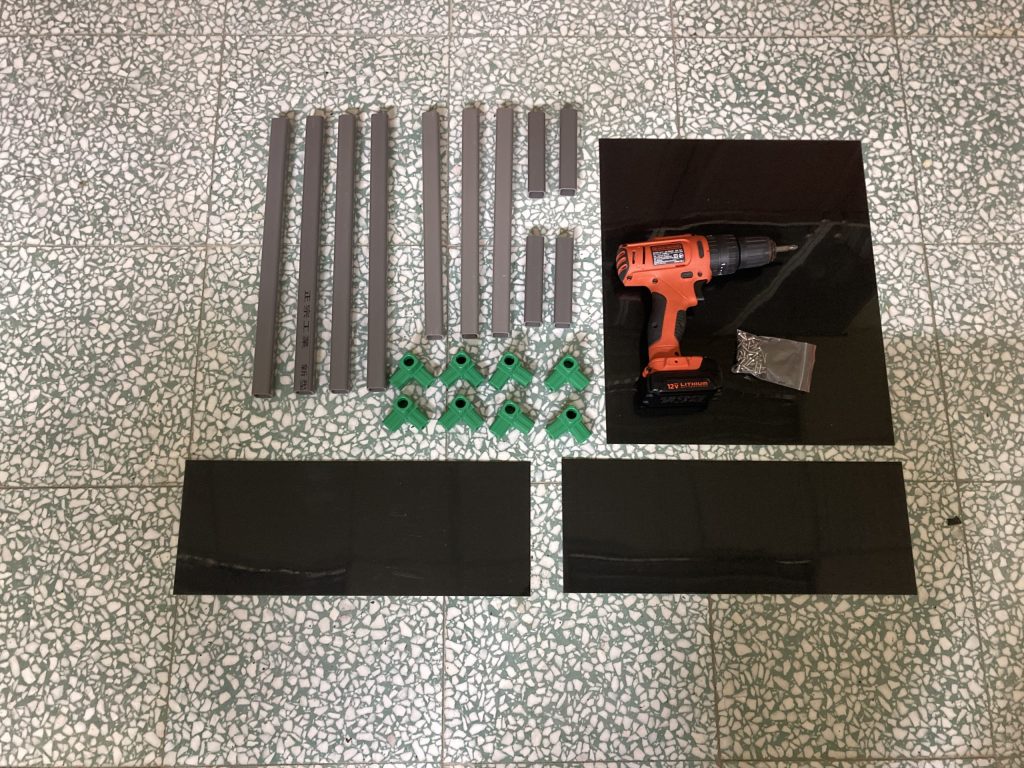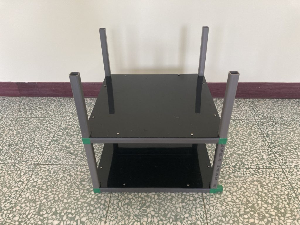 (1.2d) 方管(30cm)與前一步驟完成部件進行組裝,並用電鑽將HDPE 黑色板材(40.2cm*34.2cm*1.5mm)與其鎖上,組裝後如下圖所示。