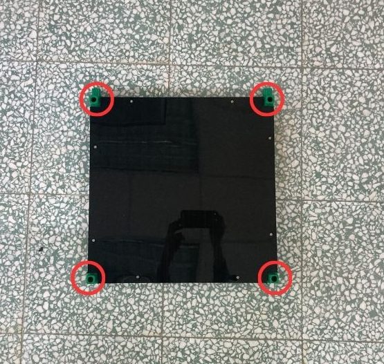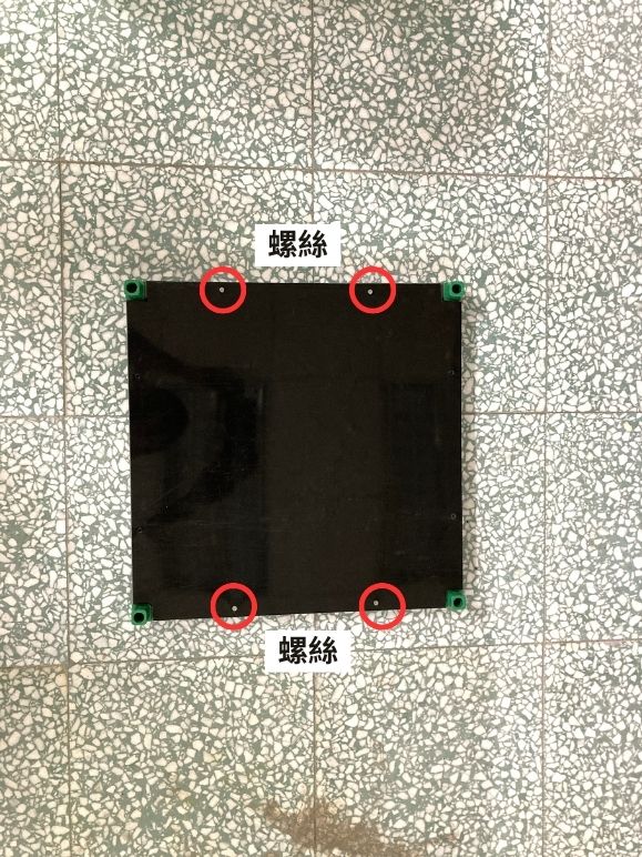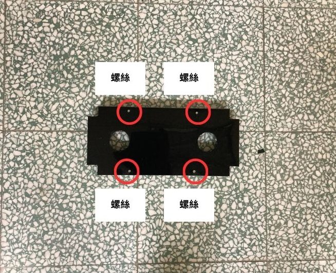 (1.1.b) 使用震動電鑽將黑色板材用四個螺絲固定在底座上(如下圖所示)