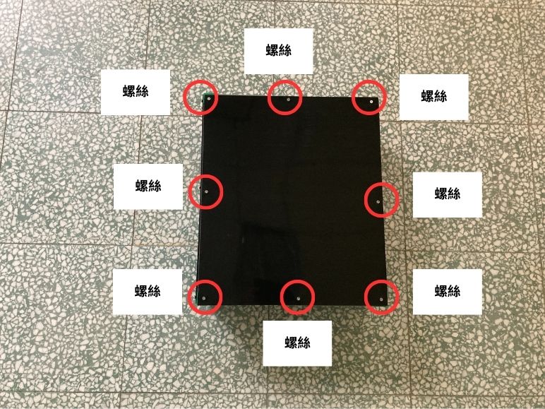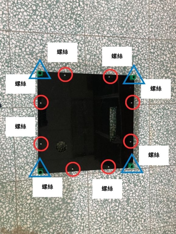 (3.1b) 使用震動電鑽將黑色板材用八個螺絲固定在底座上(如下圖所示)