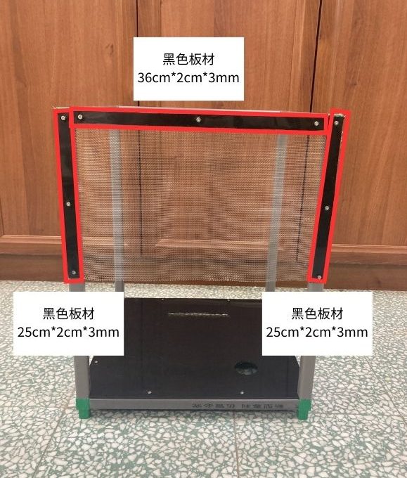 (3.2a) 用電鑽將16目白鐵網固定在3片黑色板材與方管中間,組合後如下圖所示