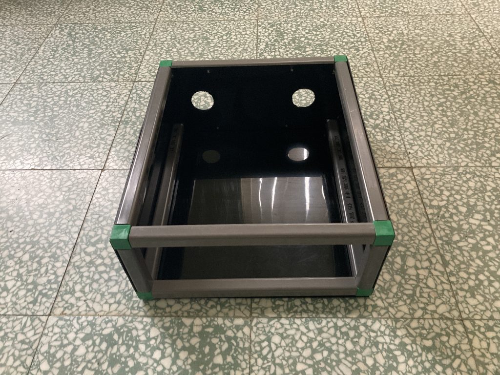 (2.2c) 用電鑽將HDPE 黑色板材(40.2cm*34.2cm*1.5mm)用螺絲鎖在外框的底部,組裝後如下圖所示。