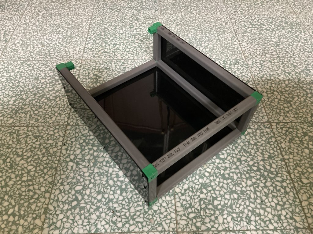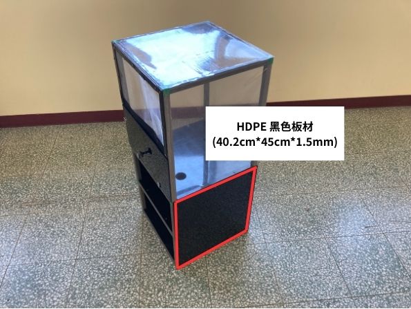 (4.d) 用電鑽將3片HDPE 黑色板材(40.2cm*45cm*1.5mm)與前一步驟完成的部件進行組裝,組裝後如下圖所示。