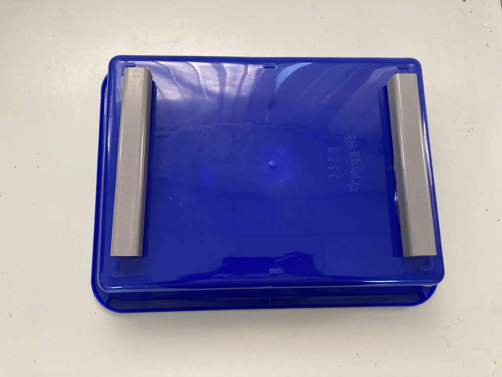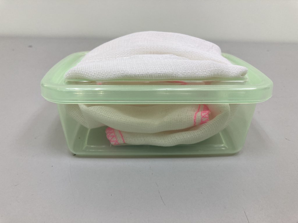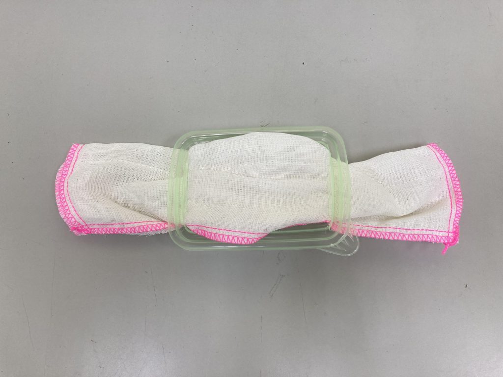 (8.a) 將 30cm*30cm 的抹布裁取二分之一,同時將水盒的蓋子兩端分別割出兩條直線並將抹布塞入其中,完成後如下圖所示。