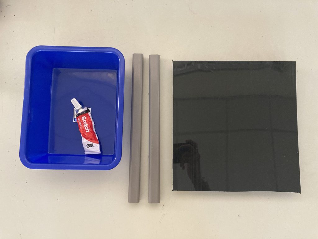 (2.3a) 用3M強力接著劑將2個方管(25cm)黏到HDPE 黑色板材(25mm*25mm*3mm)並擺上285密林盆,如下圖所示。